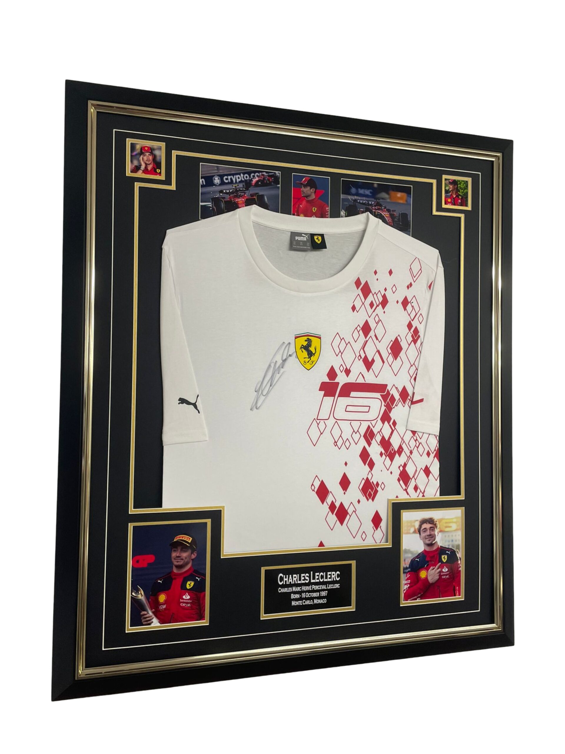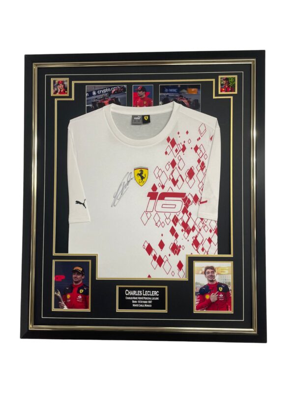 Oprawiona koszula z autografem Charlesa Leclerca, w komplecie z Certyfikatem Autentyczności.