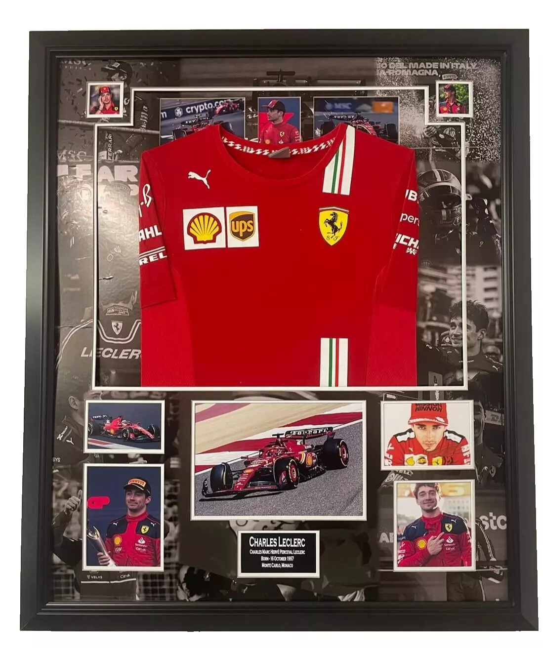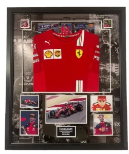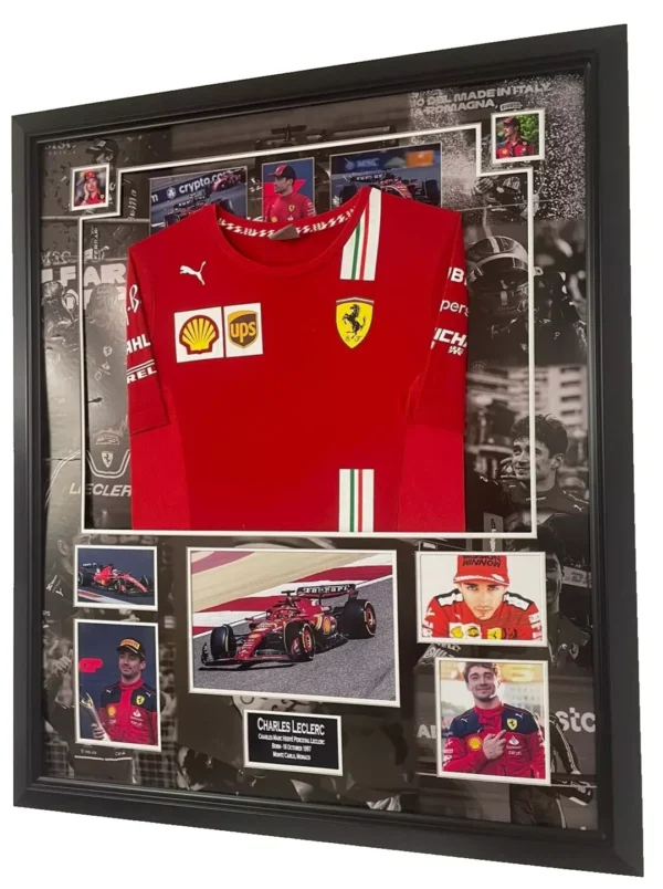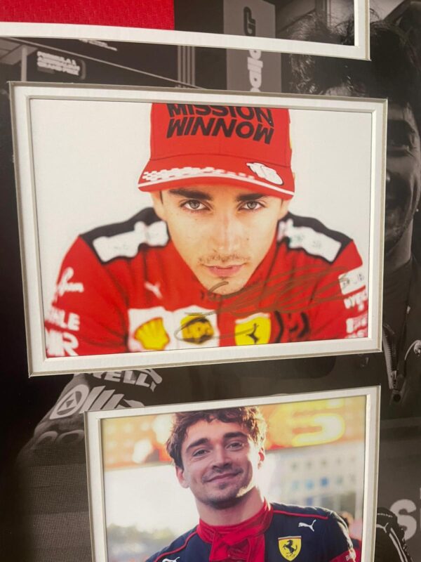 Oprawione zdjęcie z autografem Charlesa Leclerca, w komplecie z koszulką i Certyfikatem Autentyczności.